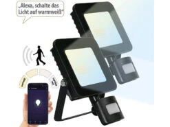Luminea Home Control WLAN LED-Strahler:4er-Set WLAN-Fluter, CCT-LEDs, App, PIR, 1.600 Lm, 20 W, IP44