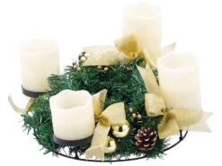 - Adventskranz, geschmückt mit Tannenzapfen, goldfarbenen Kugeln und Schleifen