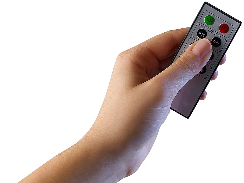 Der Clou: Durch den Sleep-Timer gehen die Stimmungskerzen nach wahlweise 4 oder 8 Stunden automatisch aus. Das ist extrem bequem und ideal als Nachtlicht oder fürs Schaufenster. Ihren Bedienkomfort rundet die Fernbedienung im Kreditkarten-Format hervorragend ab.