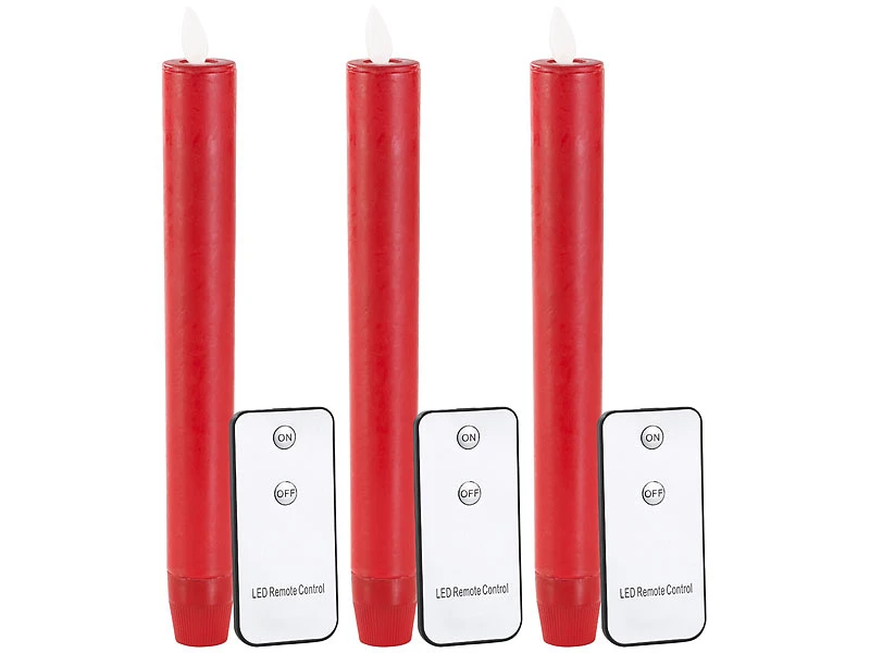 - 3er-Set LED-Stabkerze inklusive Fernbedienung mit Knopfzelle (CR2025) und deutscher Anleitung – Wachs Kerzen, Flammenlose – Außerdem relevant oder passend zu: Docht, Advent, Pyramidenkerzen, Fernbedienungen