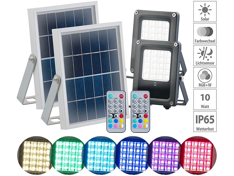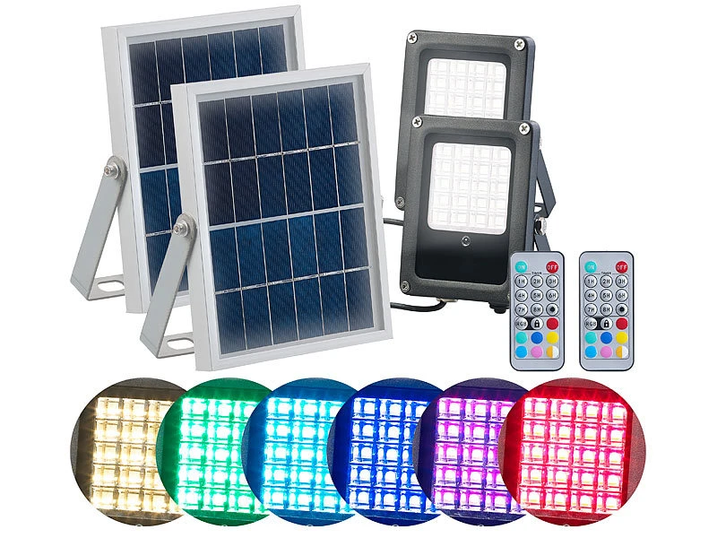 - 2 LED-Fluter jeweils inklusive Solarpanel, Fernbedienung, Montage-Zubehör, 2 Erdspießen und deutscher Anleitung – LED Solarfluter – Außerdem relevant oder passend zu: RGB, BBQ, blaue, Grill, Kette, Farbe, Blume, Blumen, Grills, Lampen, Leuchte, Wandlampe, Partylicht, Gartendeko, Baustrahler, Bodenleuchte, Farbwechsler, Lichterkette, Pflanzenlicht, Pflanzenlampe, Arbeitsleuchte, Fernbedienungen, Pflanzen Sensor, Zeitschaltuhr mit Dämmerungsschalter