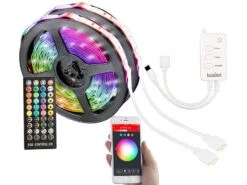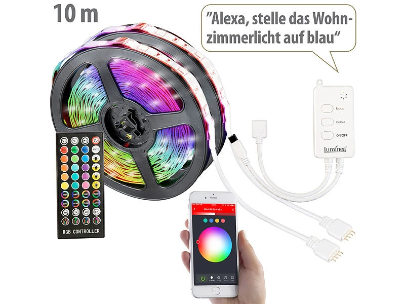 Bequeme und flexible Steuerung: Per kostenloser App steuern Sie Ihren Lichtstreifen ganz gemĂĽtlich vom Sofa aus – und von weltweit! Wählen Sie die Helligkeit ganz nach Wunsch. Auch die Lichtfarbe stellen Sie individuell in allen Farben des Regenbogens ein – wählen Sie aus 16 Mio. Farbtönen! Liegt Ihr Smartphone gerade nicht griffbereit, nutzen Sie einfach die Fernbedienung.