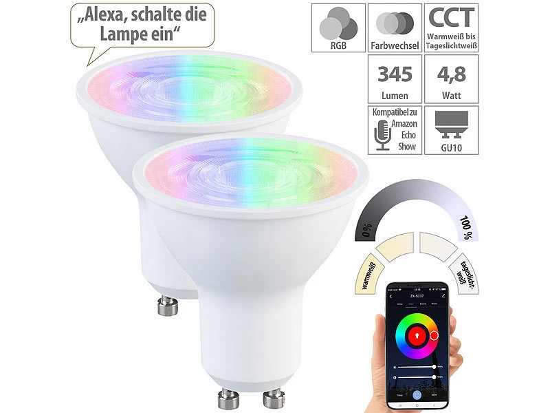 - Anpassbare Lichtfarbe: RGB für 16. Mio. Farbtöne und CCT mit 2200 – 6500 K (warmweiß bis tageslichtweiß)