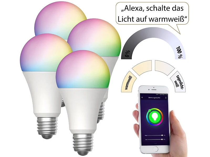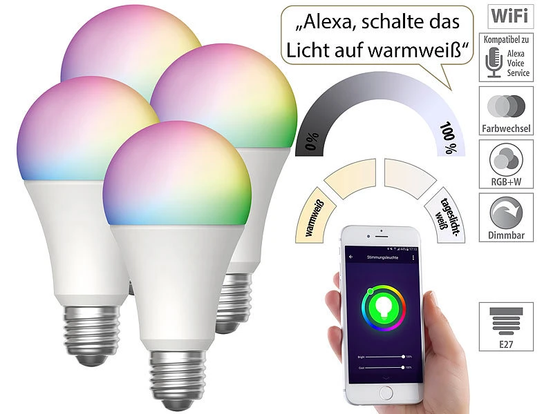 - 4 Lampen LAV-150.rgbw inklusive deutscher Anleitung – Alexa Glühbirnen – Außerdem relevant oder passend zu: Huawei, Wecker, Pendel, Tablet, Deckenlampe, Farbwechsler, Deckenleuchte, Leuchtmittel kaltweiß