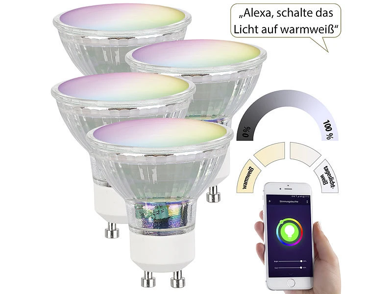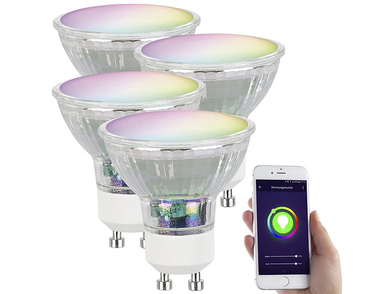 - 4 WLAN-Glas-LED-Lampen inklusive deutscher Anleitung – WLAN-LED-Lampen GU10 – Außerdem relevant oder passend zu: PC, RGBW, Voice, Halogen, Schalter, Glühbirne, Glühbirnen, Halogenlampen