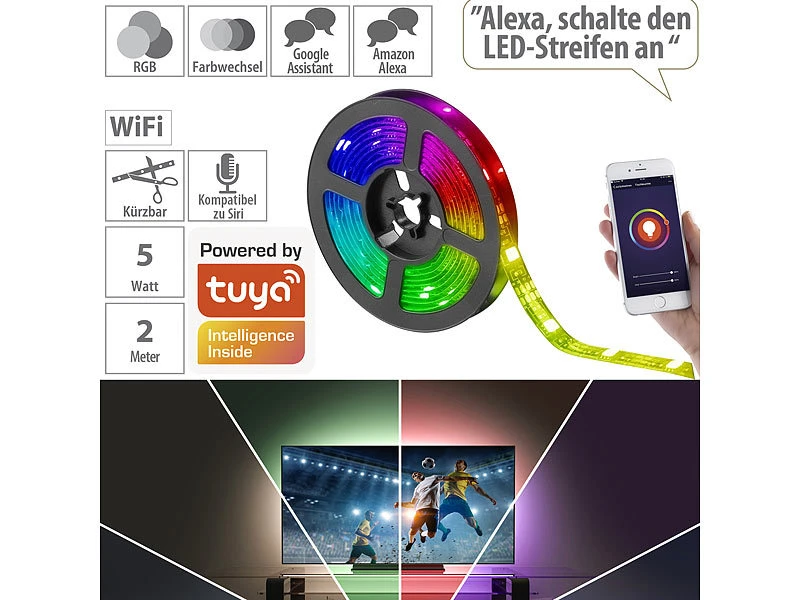 - 2er-Set WLAN-RGB-Lichtstreifen inklusive Controller und deutscher Anleitung – LED-Ambientebeleuchtung – Außerdem relevant oder passend zu: TV, Band, Kabel, Lampe, Party, Strip, Stripe, Strips, Leiste, Leisten, Stripes, Fernseher, Lichtleiste, Weihnachten, Farbwechsler, Fernbedienung, Weihnachtsbeleuchtung, Weihnachtsbaumbeleuchtung
