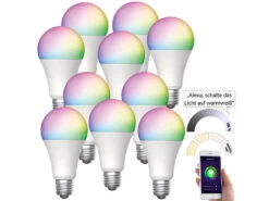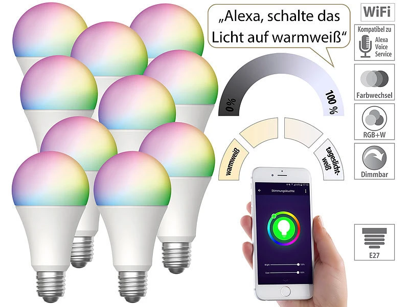 - 10 Lampen LAV-150.rgbw inklusive deutscher Anleitung – WLAN-LED-Lampen E27 RGBW – Außerdem relevant oder passend zu: PC, Farbe, Wecker, Pendel, Tablet, farbige, kaltweiß, Glühlampen, Glühbirnen, Deckenlampe, Farbwechsler