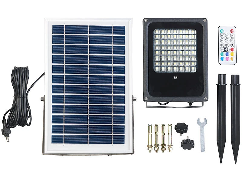 - Deko-Fluter inklusive Solar-Panel, Anschlusskabel, Fernbedienung, 2 Erdspießen, Montage-Material und deutscher Anleitung – Solar.Flutlicht mit Fernbedienung – Außerdem relevant oder passend zu: Grill, blaue, Leuchte, Pflanzen, Solarpanel, Bodenleuchte, Außenlicht warmweiß, Zeitschaltuhr mit Dämmerungsschalter