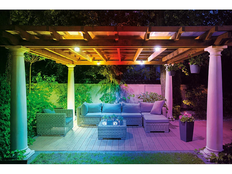 Lassen Sie Haus, Hof und Garten erstrahlen: Bringen Sie Ihren neuen Fluter einfach an Wand, Decke oder am Boden an – drinnen wie draußen. Denn Ihr Farbwunder ist flexibel montierbar und wetterfest. Schon tauchen Sie Garten, Innenhof oder Partykeller in einen prachtvollen Lichterzauber!