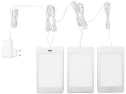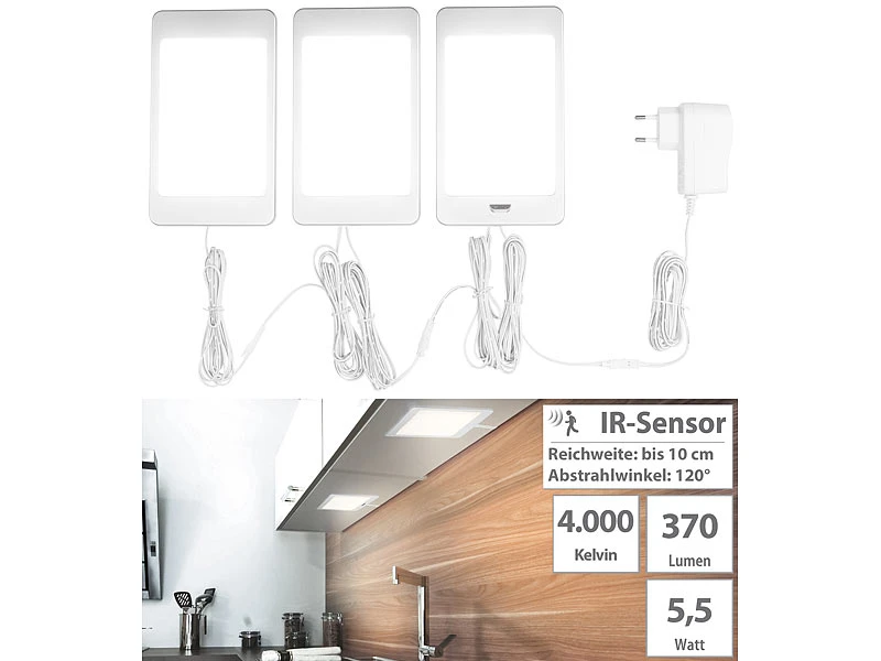- 3er-Set LED-Unterbaupanels inklusive Anschlusskabel (1,5 m), 2 Verbindungskabeln (je 2 m), Montagematerial und deutscher Anleitung – Unterbaulampen – Außerdem relevant oder passend zu: Möbel, Küche, Panels, Dimmer, Leiste, dimmbar, Leisten, Infrarot, Unterbau, Deckenlampe, Beleuchtung, Nachtlichter, Deckenleuchte, Einbaustrahler, Steckdose, Unterbauleuchten warmweiß, Nachtlicht Bewegungsmelder, Schrankbeleuchtung Bewegungssensor