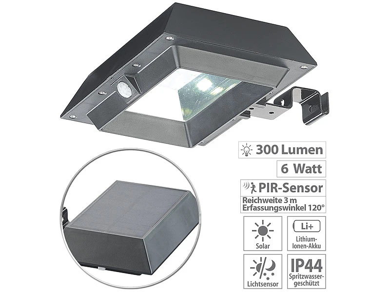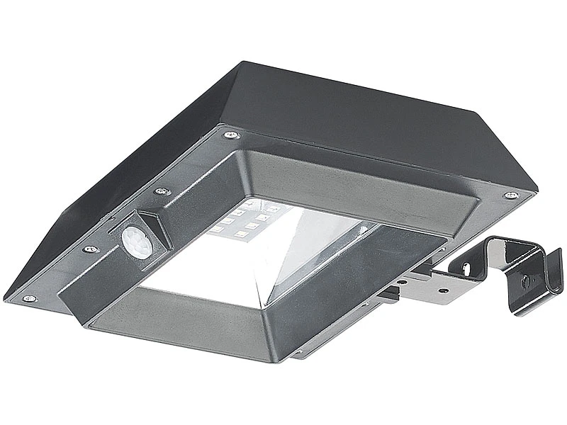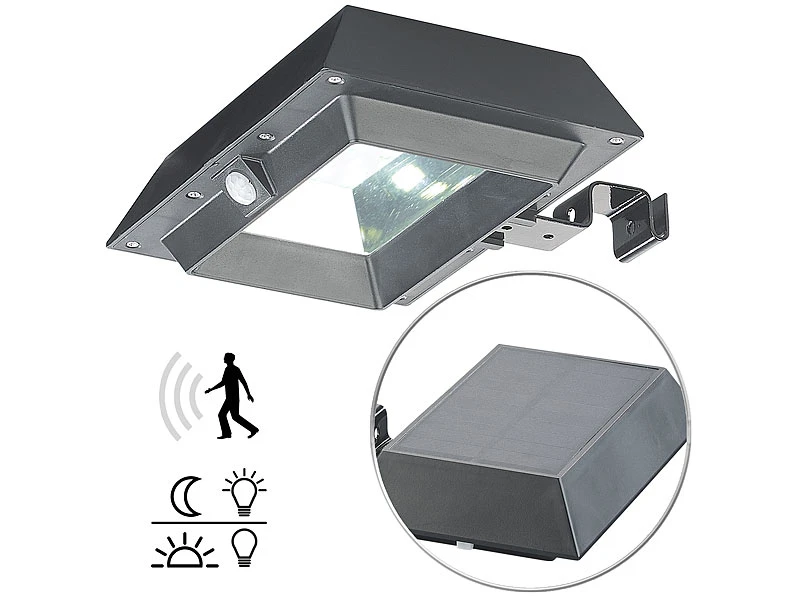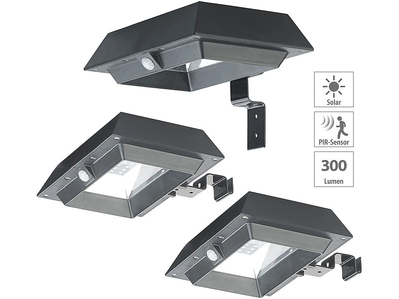 - PIR-Bewegungs-Sensor: schaltet auf volle Helligkeit bei Annäherung einer Person