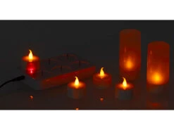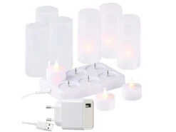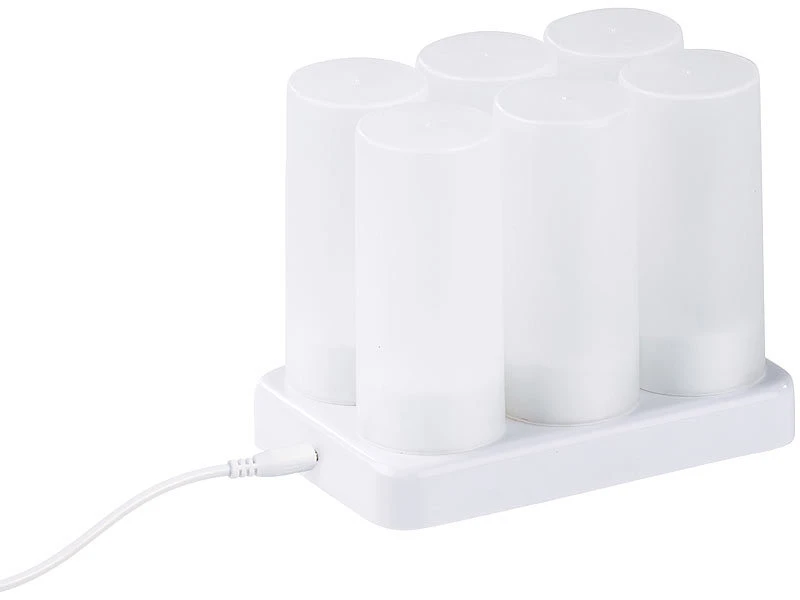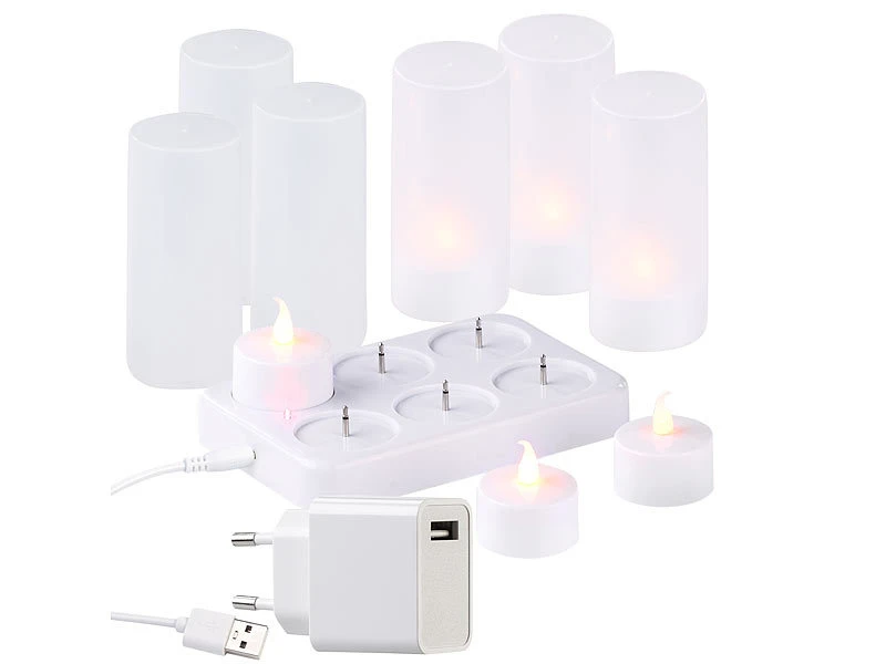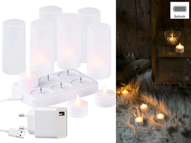 - 6 LED-Teelichter inklusive 6 Acryl-Teelichthaltern, Ladestation, Netzteil und deutscher Anleitung – LED Kerzen aufladbar – Außerdem relevant oder passend zu: Akkus, Elektro, Aufladen, flackernd, Ladegerät, Partylicht, Elektrische, wiederaufladbar