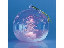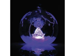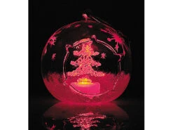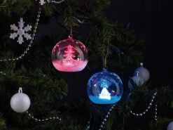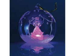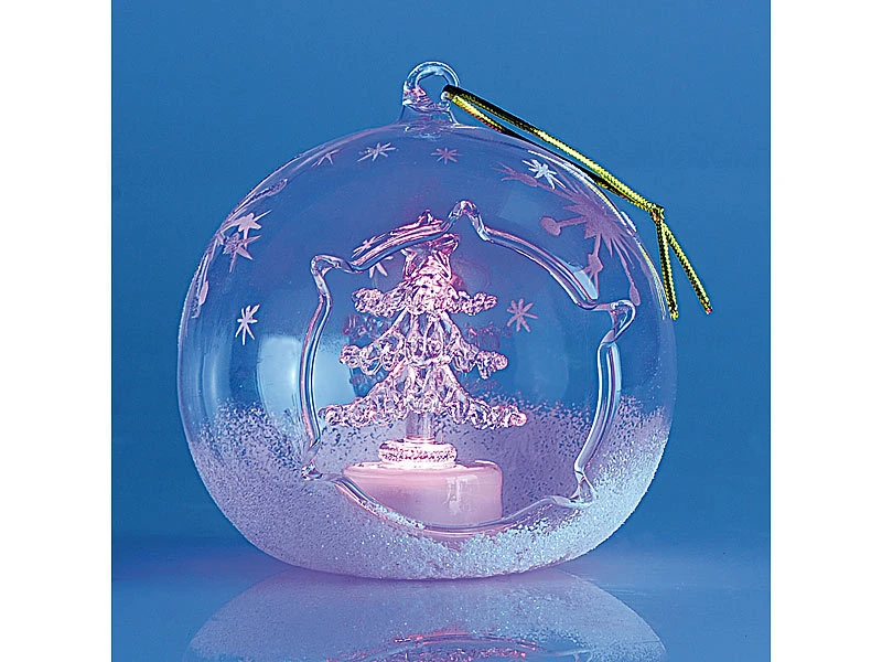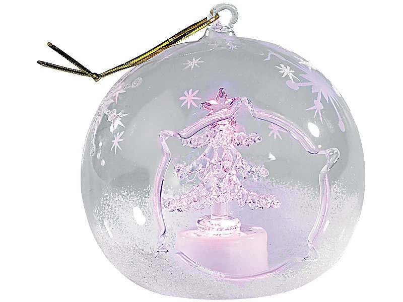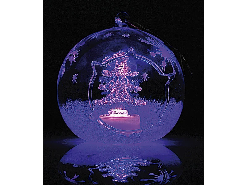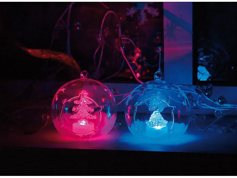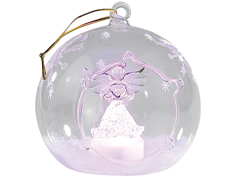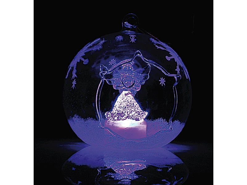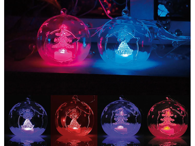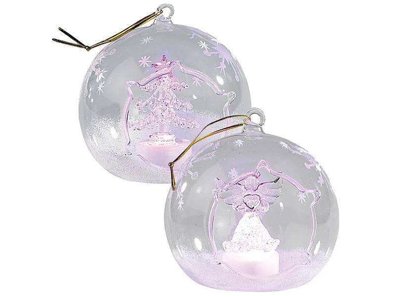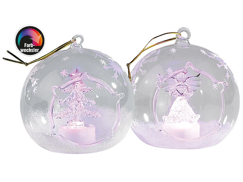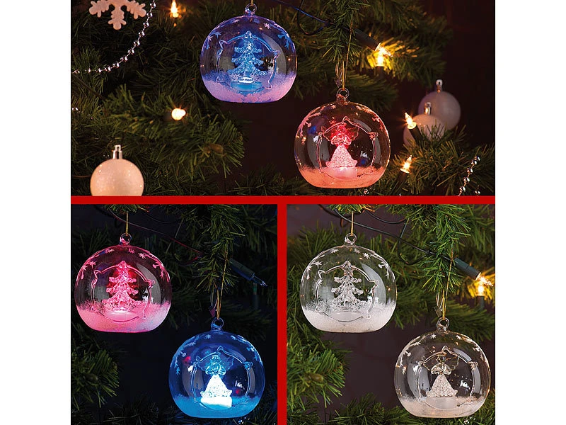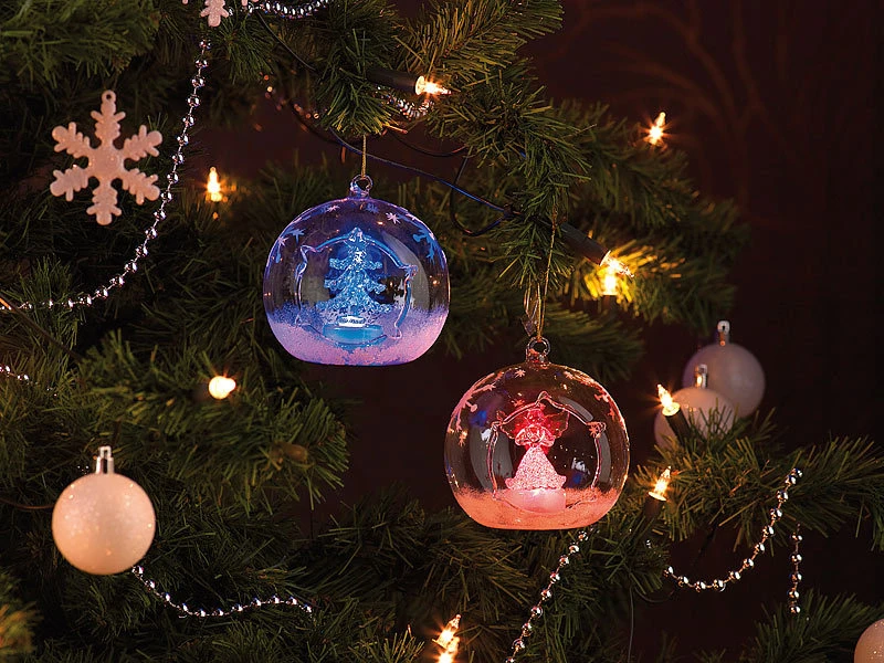 Weiß glitzernder Schnee und einzelne Eiskristalle verzieren die gläsernen Kugeln kunstvoll; im Inneren strahlen ein Engel und ein Tannenbaum abwechselnd in Blau- und Rot-Tönen .