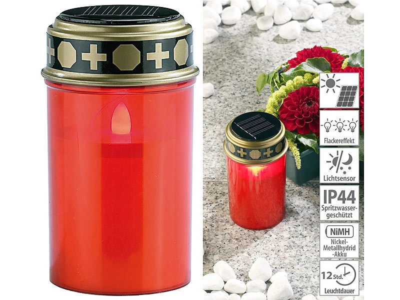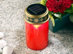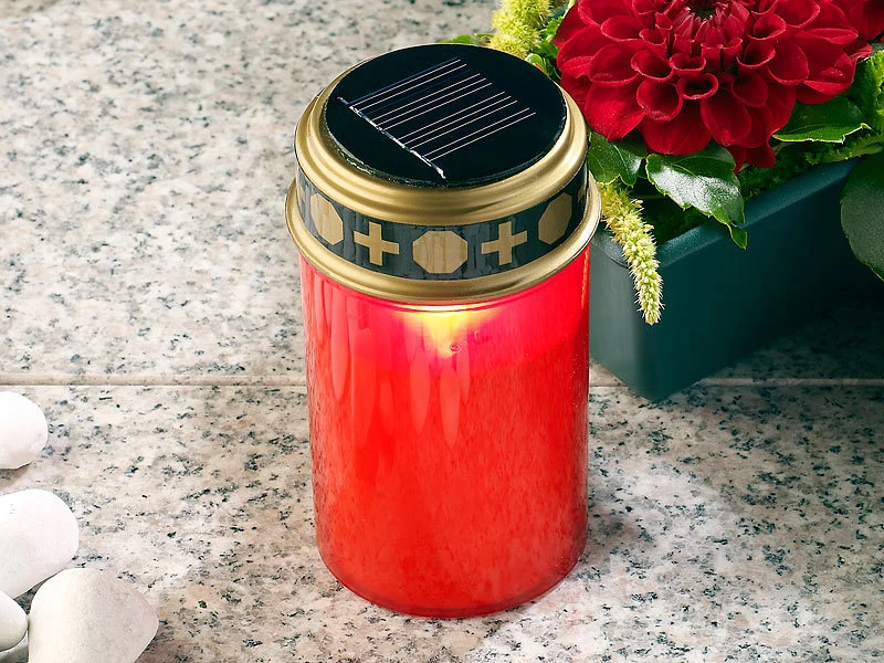 - Rote LED-Grabkerzen mit unauffälligem Solar-Panel im Deckel