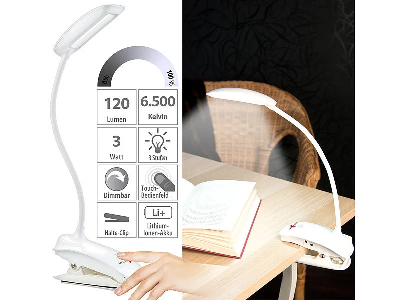 - LED-Schreibtischlampe inklusive USB-Ladekabel und deutscher Anleitung – Klemmlampe kabellos – Außerdem relevant oder passend zu: Auto, Buch, Klemmen, Tastatur, Kabellose, Table Lamp, ohne Kabel, Laptop Tisch, Solar Powerbank, Buchlampe mit Clip, Tischlampe Batterie