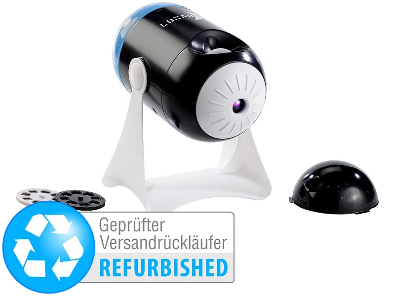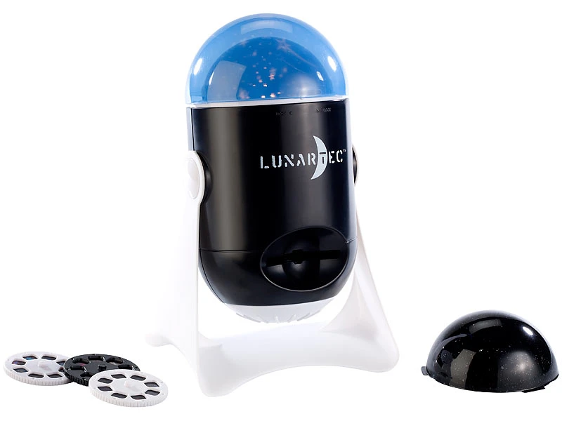 Dank des 360° rotierenden Ganzkuppelprojektors projizieren Sie den traumhaften Sternenhimmel an Zimmerdecke und -wände. Entweder realistisch, mit vielen Lichtpunkten, oder wie gemalt mit Sternschnuppen, Monden und fernen Galaxien.