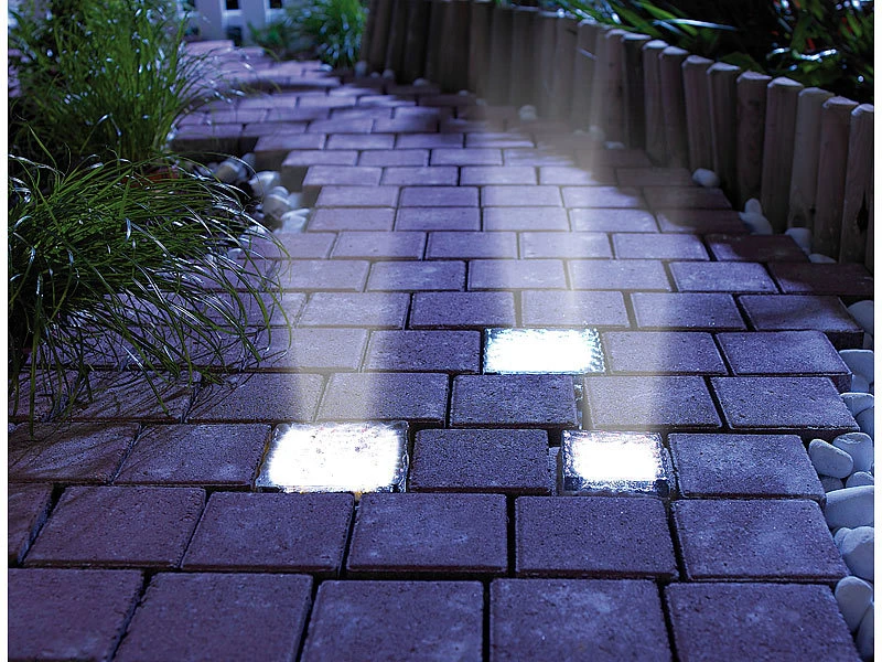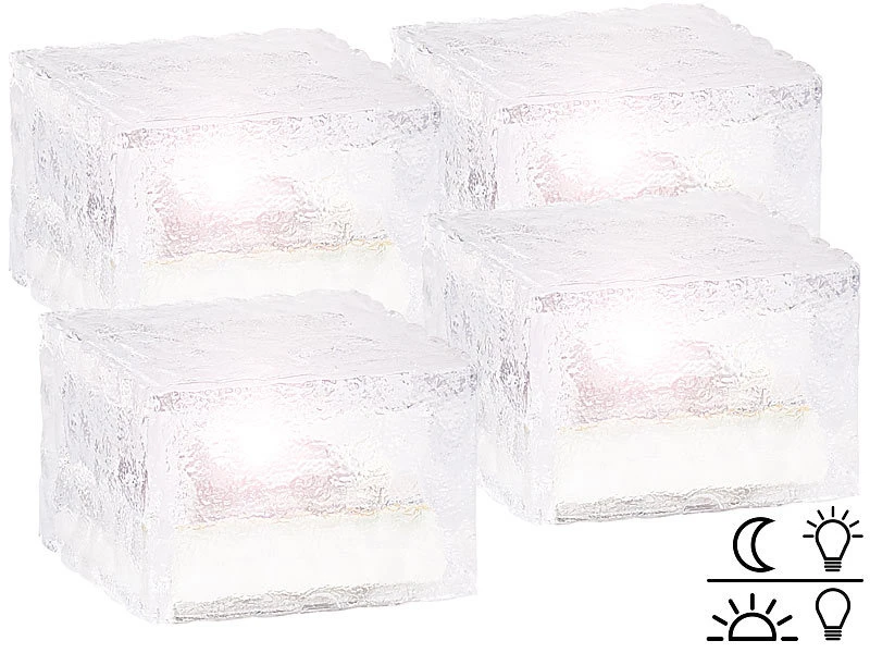 - 4 robuste, wetterfeste Glasbausteine mit integrierter extra-heller LED