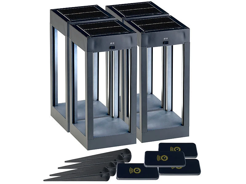 - 4 Solar-Laternen je inklusive Fernbedienung, ErdspieĂź und deutscher Anleitung – Weglampen – AuĂźerdem relevant oder passend zu: RGBW, Farbe, Kerzen, aussen, Lichter, Farbwechsler, Tischleuchten, Fernbedienungen