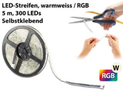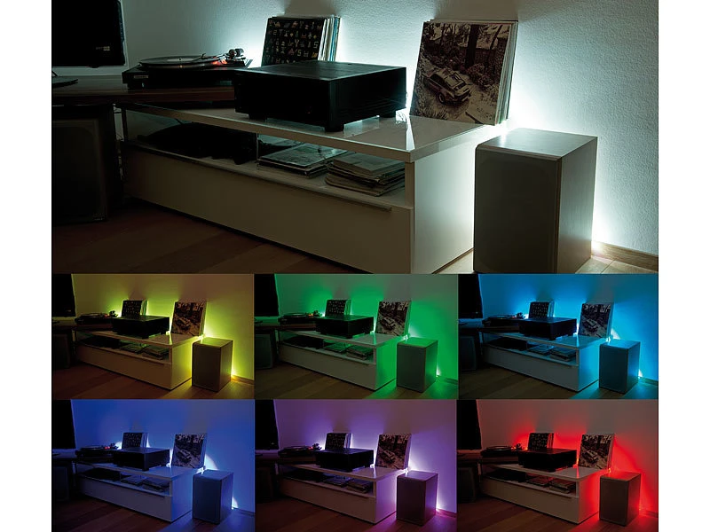 Nahezu ĂĽberall blitzschnell einsatzbereit: Einfach auf die gewĂĽnschte Länge zuschneiden und mit Hilfe der selbstklebenden RĂĽckseite auf glatten Flächen anbringen. Ideal als indirekte Beleuchtung unterm Bett, hinterm Sofa und TV oder als effektvolle Fenstereinfassung: Die SMD-LEDs spenden dauerhaft helles und angenehmes Licht – wahlweise in warmweiĂź, bunten RGB-Farben oder beides gleichzeitig.