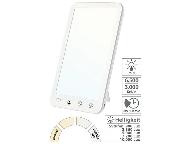 - Helligkeit in 5 Stufen einstellbar: 900/2.860/5.000/7.200/10.000 Lux