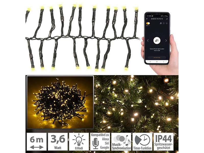 - Länge Lichterkette: 6 m, Zuleitung: 5 m, Gewicht: 650 g