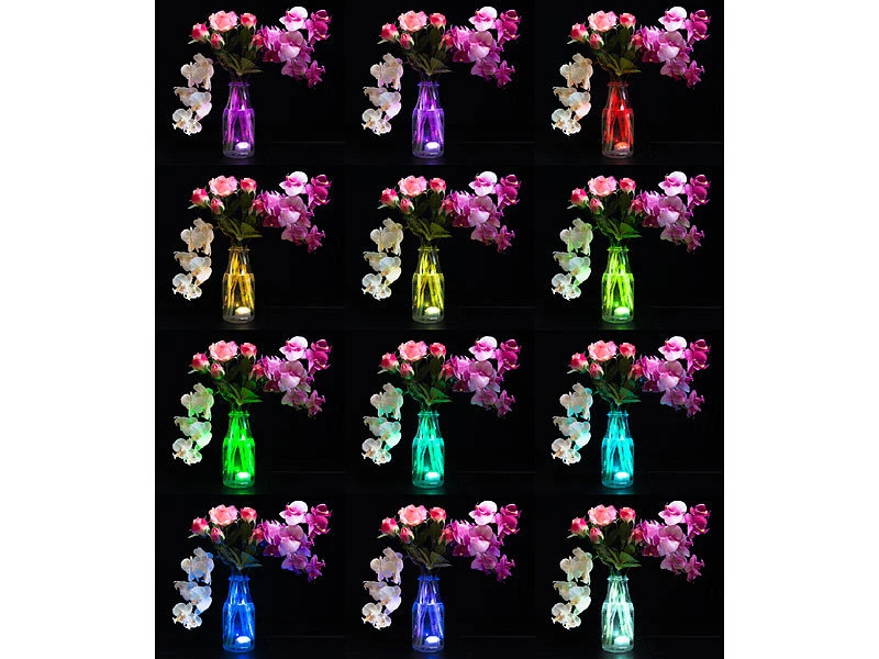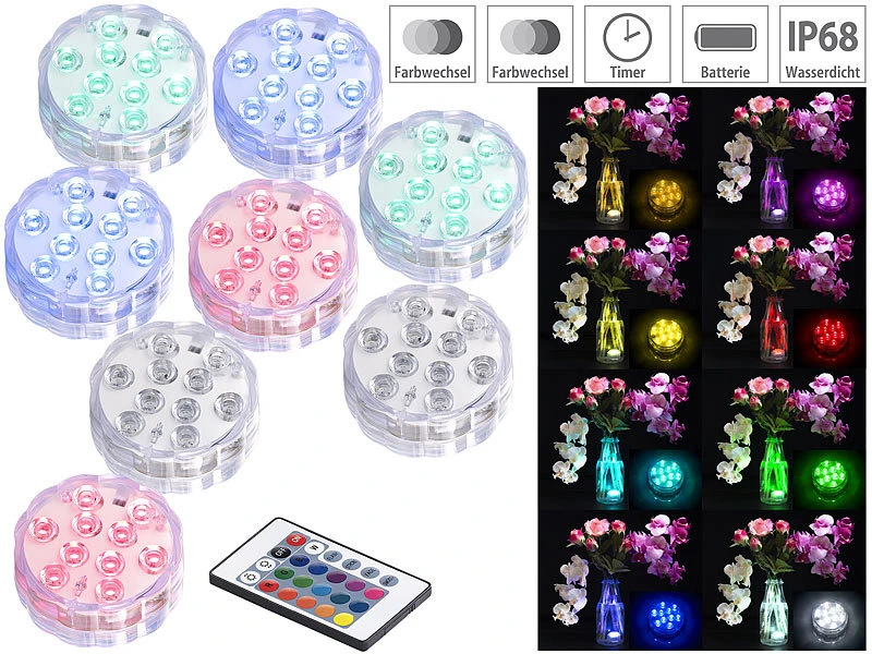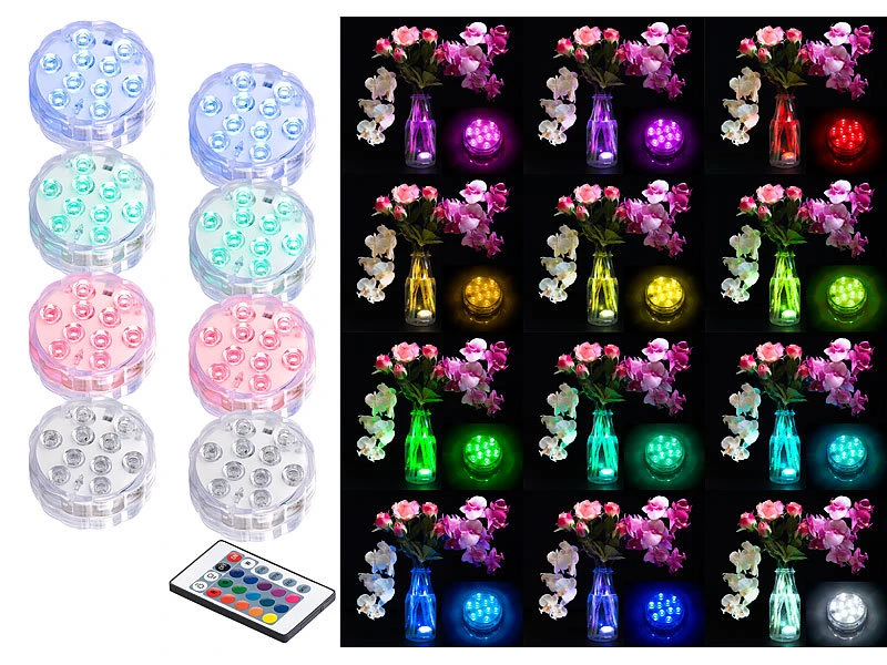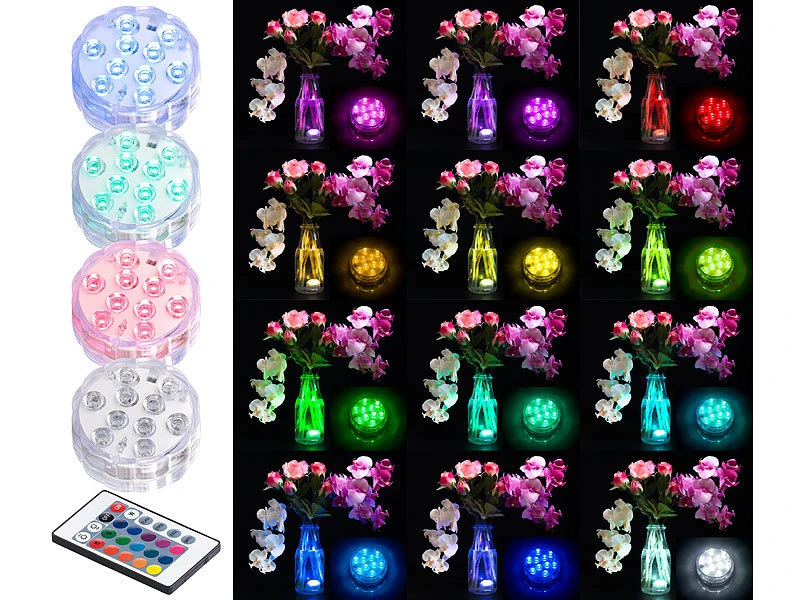 Bringen Sie Farbe ins Wasser: Legen Sie die wasserdichten LED-Leuchten einfach in Ihren Zimmerbrunnen oder in Vasen und Pflanzenbehälter. Auch im Pool, im Planschbecken oder in der Badewanne sind sie ein echter Hingucker.