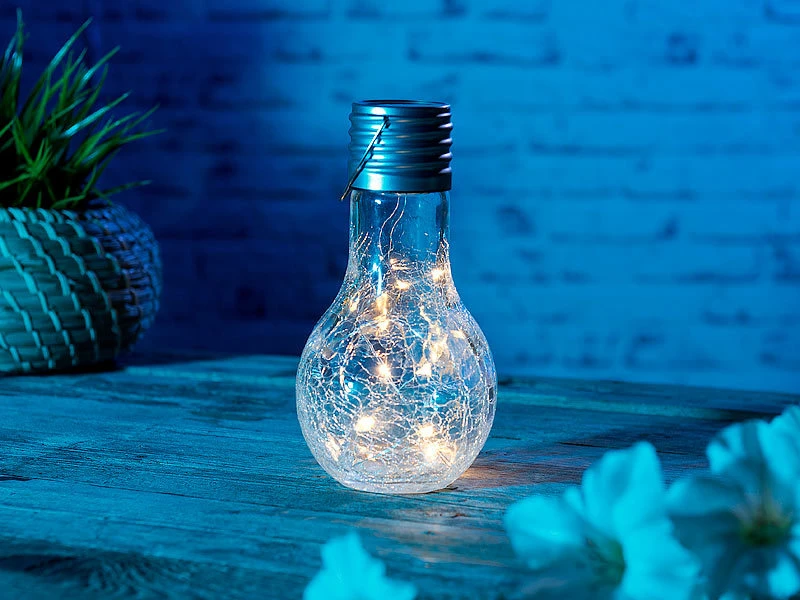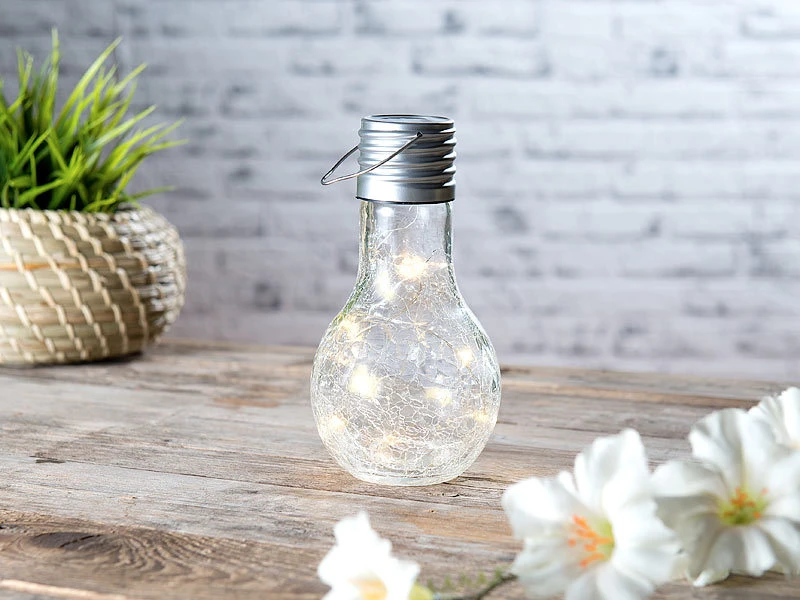 Setzen Sie ganz einfach Licht-Akzente: Die 8 warmweißen LEDs Ihrer neuen Deko-Leuchte schalten sich am Abend automatisch ein. Schon sorgt die Echtglas-Glühbirne im Crackle-Design für eine individuelle Atmosphäre – ob auf dem Balkon, der Terrasse oder im Garten.