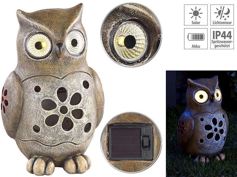 - Deko-Eule inklusive Batterie und deutscher Anleitung – Solar Gartenfiguren – Außerdem relevant oder passend zu: groß, Eulen, Licht, Lichter, Dämmerung, Grablicht, Solarmodul, beleuchtet, Solarpanel, Lichtsensor, Beleuchtung, Gartenleuchten, Dämmerungssensor, Dämmerungsschalter