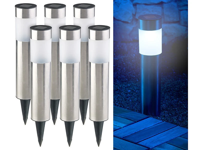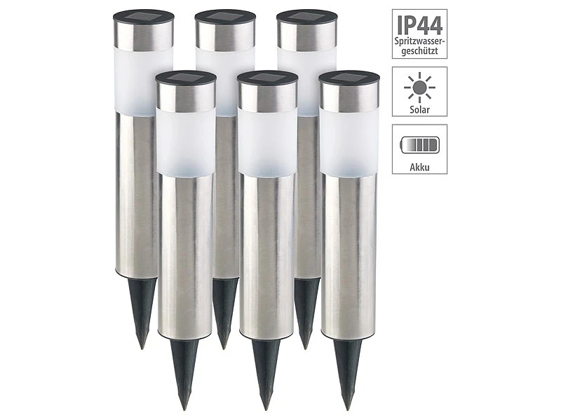 - 6er-Set Solar-Edelstahl-Wegeleuchten inklusive Erdspießen und deutscher Anleitung – LED Solar Gartenleuchten – Außerdem relevant oder passend zu: Garten, Lampen, Outdoor, Gartendeko, Aussenlampe, Standleuchte, Bodenleuchte, Gartenstecker