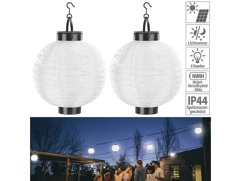 Deko rund ums Haus: Dank Akku-Betrieb mit Solarstrom-Versorgung sind Sie völlig unabhängig von der Steckdose. Am praktischen Haken hängen Sie Ihre Lampions flexibel auf.