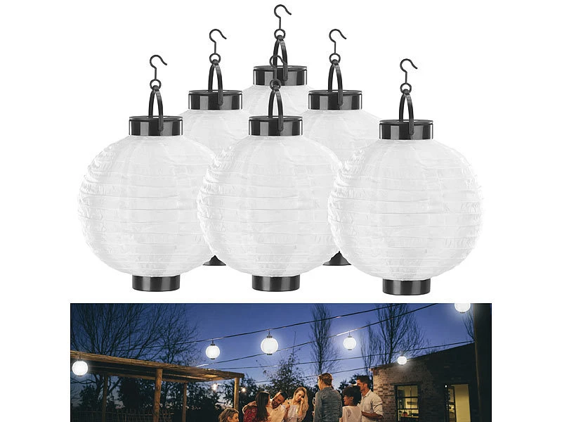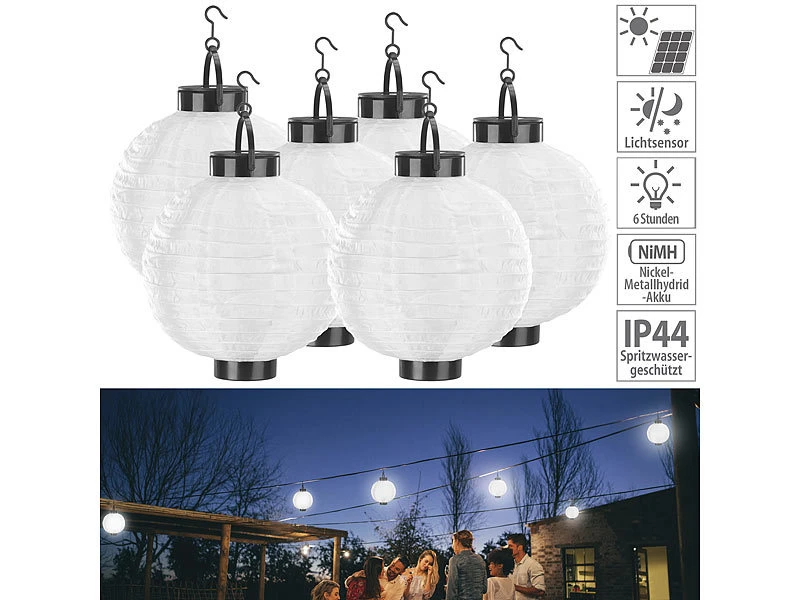 - 6 Solar-LED-Lampions inklusive Akku, Befestigungs-Haken, 4 Stützstäben und deutscher Anleitung – Garten Lampions Solar wetterfest – Außerdem relevant oder passend zu: Akkus, Strips, Laterne, Outdoor, Terrasse, Partylicht, Solarkugeln, Beleuchtung, Lichterkette, Lichterketten
