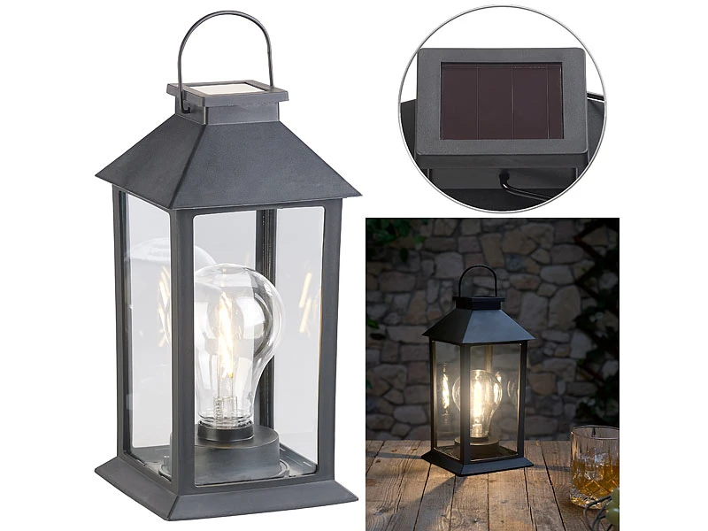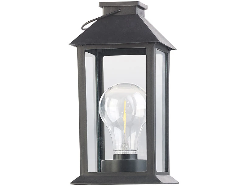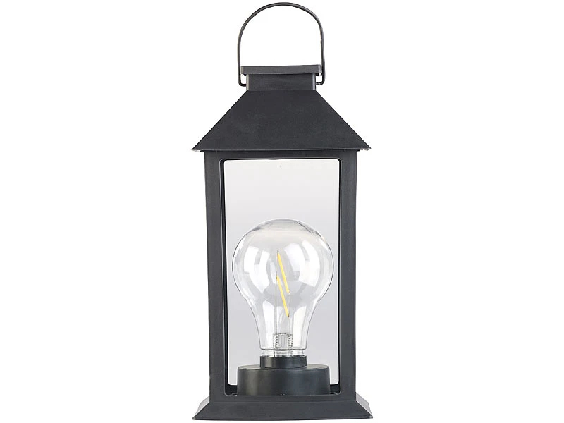 Klassische Laterne mit vertrauter Glühbirnen-Optik: 2 Filament-LEDs imitieren den altbekannten Glühdraht und lassen ein angenehm warmweißes Licht aufleuchten.