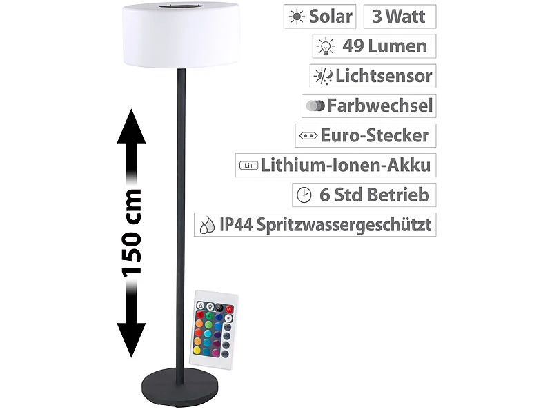 - Farbwechselnde Solar-LED-Stehleuchte für innen und außen