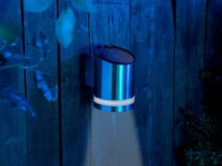 Tankt Sonnenkraft, spart Strom und Geld: Ein Solar-Panel frischt jeden Tag den Akku der Wand-Laterne auf: vollkommen ohne Stromanschluss. Das freut den Geldbeutel und die Umwelt.