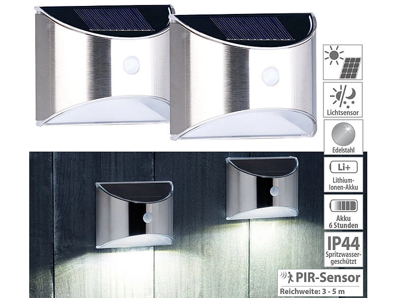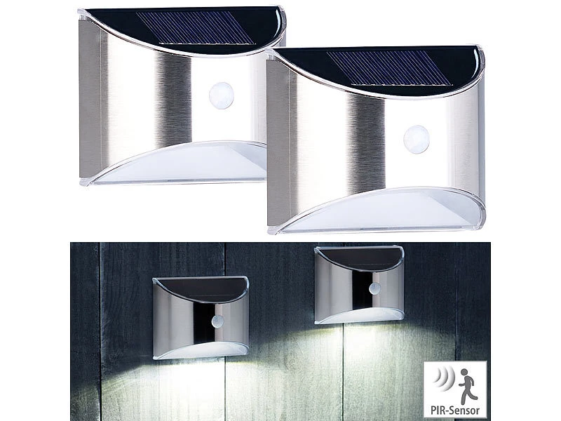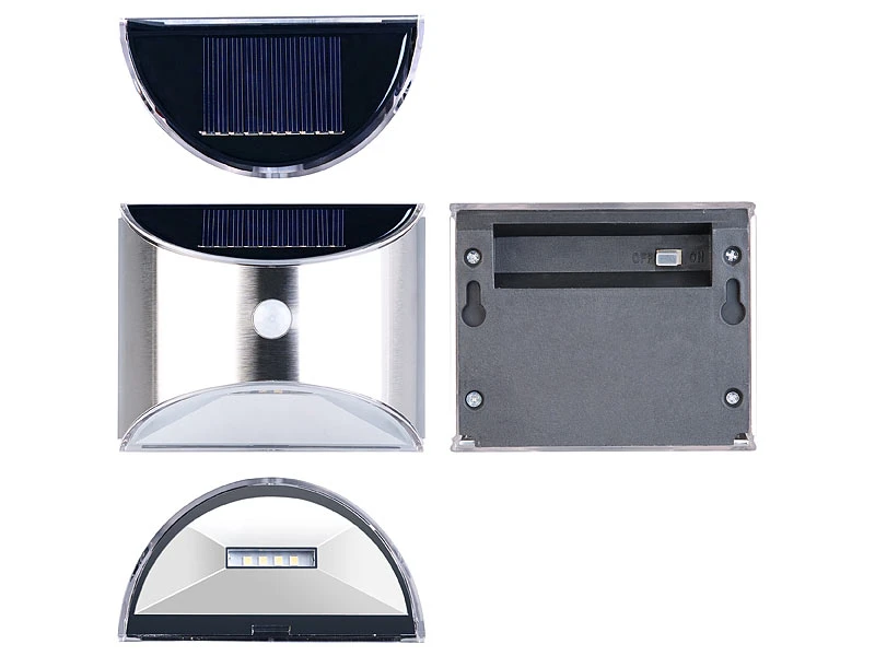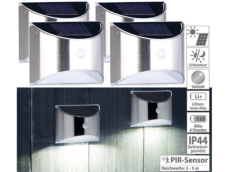 - 4er-Set Solar-LED-Wandleuchten WL-130.solar inklusive Befestigungsmaterial und deutscher Anleitung – AuĂźenlampe Solar Bewegungsmelder – AuĂźerdem relevant oder passend zu: Licht, Lampen, Leuchte, Infrarot, Strahler, Wegeleuchten, Lampe Bewegung, Fluter Bewegungsmeldern