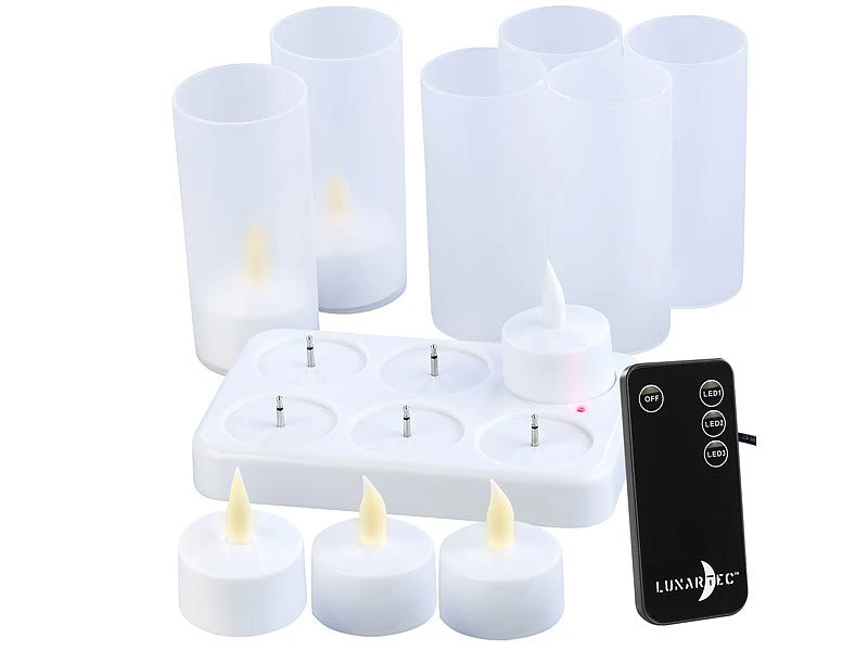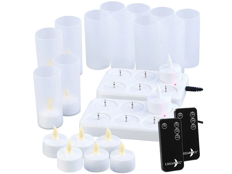 - 12 LED-Teelichter inklusive Dekobehälter aus Kunststoff, Fernbedienung inklusive Knopfzelle, Ladestation, Netzteil und deutscher Anleitung
