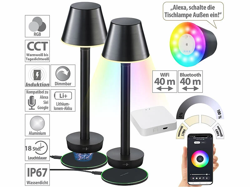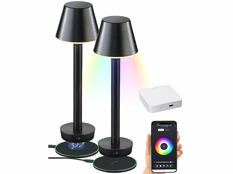 - Kabellose Outdoor-Tischlampe mit Akku und Qi-Ladematte