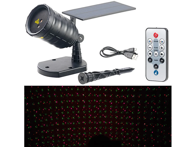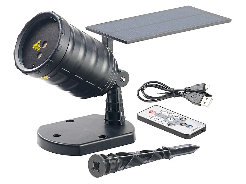 - Solar-Laserprojektor inklusive USB-Ladekabel, Erdspieß, Wandhalterung, IR-Fernbedienung und deutscher Anleitung