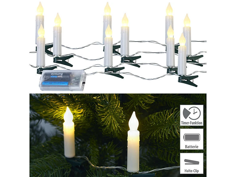 Festliche Beleuchtung für Ihren kleinen Tannebaum: Diese LED-Mini-Lichterkette mit 130 cm Länge lassen Sie an Ihrem Tannebaum dank LEDs auch unbeaufsichtigt leuchten. Per Timer schalten sich die Kerzen zudem automatisch ein und aus. Und dank Batteriebetrieb brauchen sie nicht einmal eine Steckdose in der Nähe!