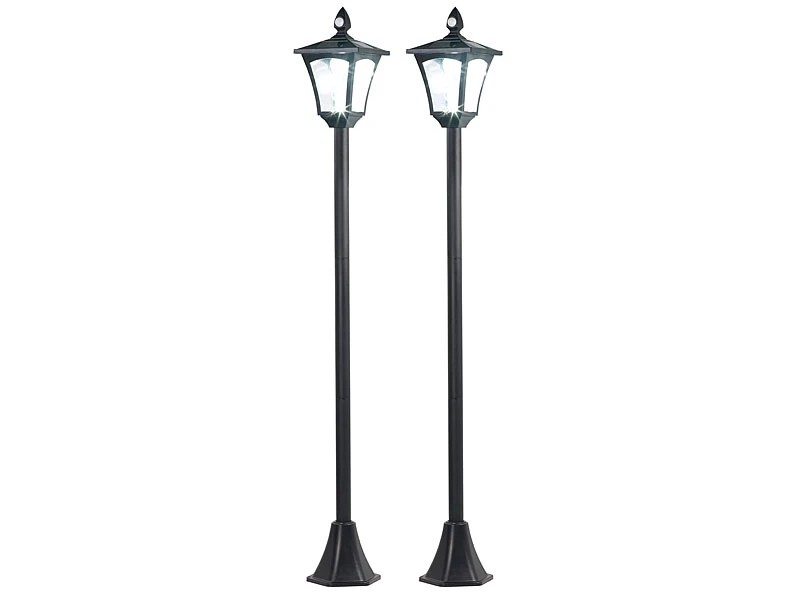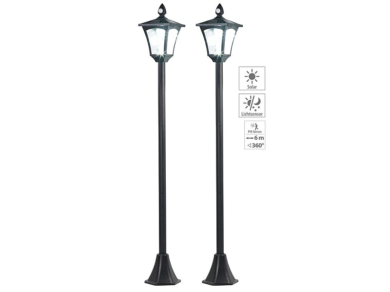 - 2 Solar-LED-Gartenlaternen je inklusive Montage-Material, StandfuĂź, ErdspieĂź, Akku und deutscher Anleitung – LED Laterne mit Bewegungsmelder – AuĂźerdem relevant oder passend zu: Balkon, Garten, Outdoor, Detektor, Bewegung, Infrarot, Nachtlicht, Beleuchtung, Kabellose Stehlampe, Gartenleuchte Standleuchte